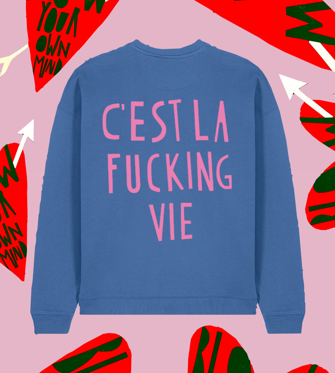 All year round , soft, bubble pink, unisex, slightly oversized fit with vibrant pink paper art inspired C,et la vie back print.